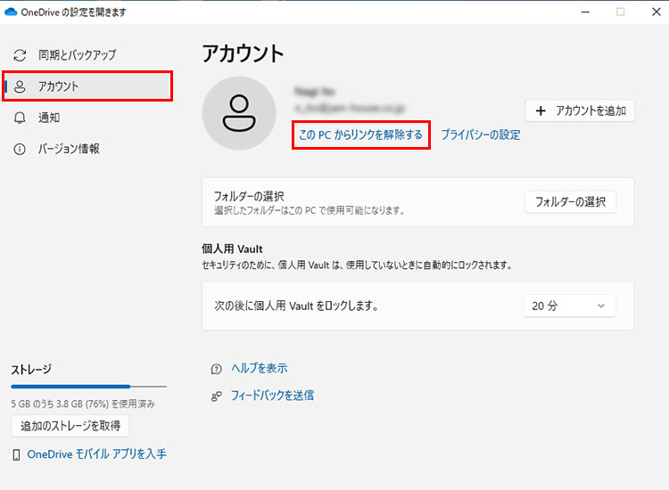 [アカウント]をクリックし画面を切り替え、[このPCからリンクを解除する]をクリックします。別画面が表示されている場合、[アカウント]→[このPCのリンクを解除]をクリックします。