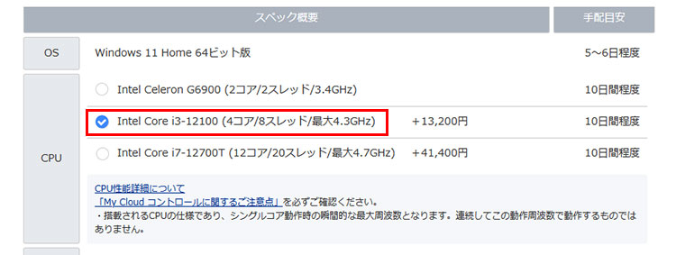 WEB MARTではCPUのカスタマイズも可能です。
