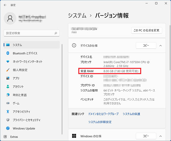 現在お使いのパソコンのメモリの容量は「設定」の画面から確認することができます。詳しくは、以下のQ&Aを確認してください。