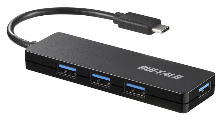 写真は、4ポートのUSBバスパワーハブ、「USB 3.1(Gen1) Type-C 4ポート バスパワーハブ ブラック BSH4U120C1BK」(バッファロー)です。