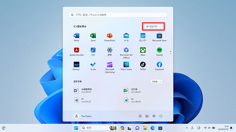 パソコンで、「スタート」ボタンをクリックし、「すべてのアプリ」をクリックします。