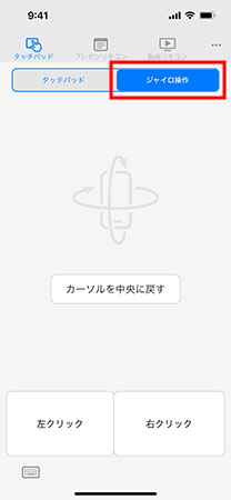 ジャイロ機能搭載のスマホの場合、「ジャイロ操作」をタップすると、スマートフォンを傾けることでマウスカーソルを移動することができるようになります。スマートフォンをレーザーポインターのようなイメージで動かせばいいので、直感的に操作できます。