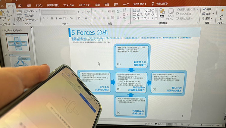 また、PowerPointを使ったプレゼンテーションでは、スライドショーの操作や、スマートフォンをレーザーポインターのように利用することができます。