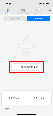 「カーソルを中央に戻す」をタップすると、マウスカーソルをパソコンの画面中央に移動することができます。