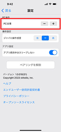 設定画面が開きます。「PC音量」のマイナスまたはプラスボタンで音量を調節することができます。