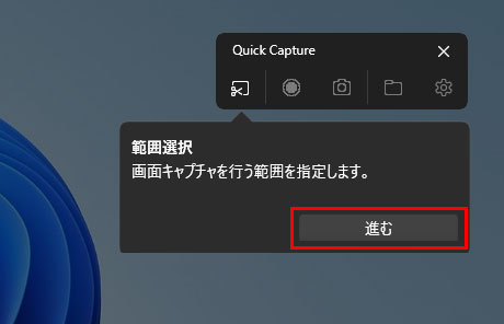 「Quick Capture」が起動し、アイコンが表示されます。ボタンの説明が表示されるので、内容を確認しながら「進む」をクリックしていきます。