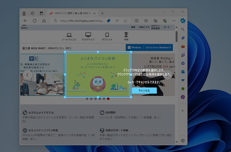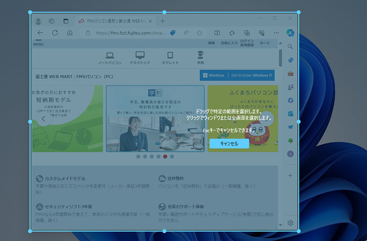 「範囲選択」をクリックした後、キャプチャする範囲をドラッグして指定します。