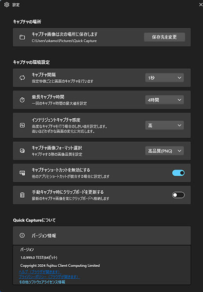 「アプリの動作設定」をクリックすると、設定画面が表示されます。「キャプチャの場所」の「保存先を変更」をクリックすると、キャプチャ画像を指定したフォルダーに保存できます。