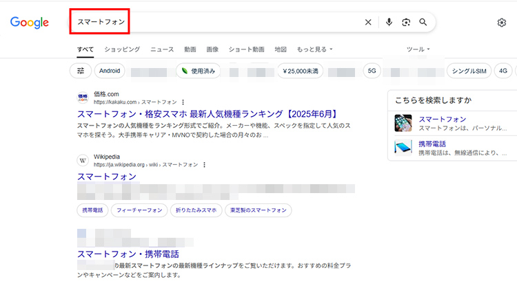 「スマートフォン」で検索した結果。スマートフォンの価格や製品情報のページも検索されてしまいます。