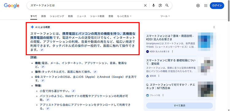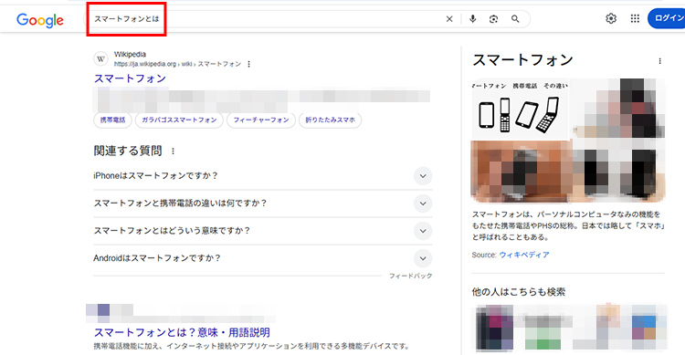 例えば、「スマートフォン」について調べたい場合、キーワードに「スマートフォン」とだけ入力して検索すると、製品情報のページなども出てきます。「スマートフォンとは」と入力して検索することで、スマートフォンがどのようなものなのかを説明したページを検索することができます。