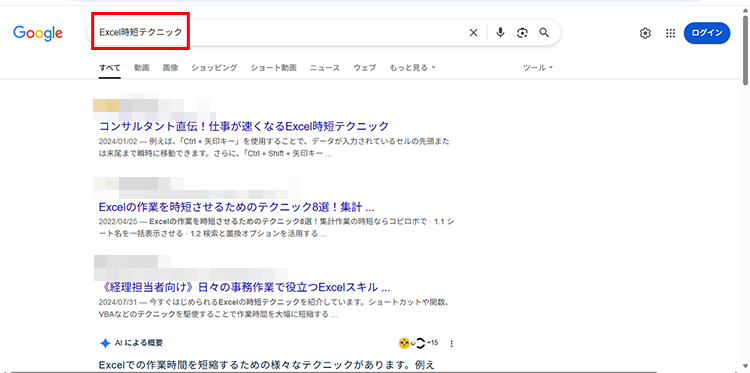 「Excel時短テクニック」で検索すると、「Excel」や「時短」、「テクニック」といったキーワードを含む情報が検索されます。