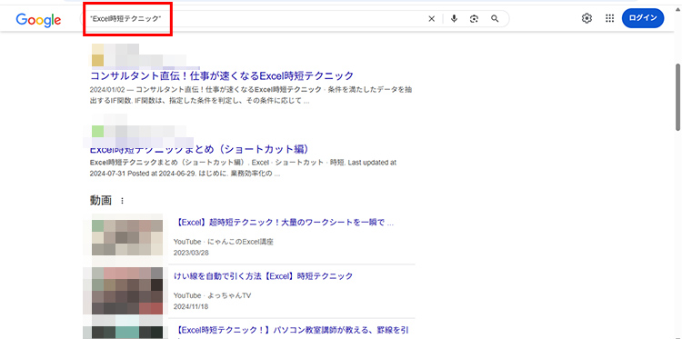 「”Excel時短テクニック”」で検索すると、「Excel時短テクニック」という1つながりのフレーズを含む情報が検索されます。