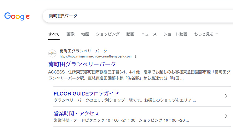 「南町田クランベリーパーク」を調べようとして、「クランベリー」の部分が思い出せない場合、「南町田*パーク」と入力して検索を実行します。