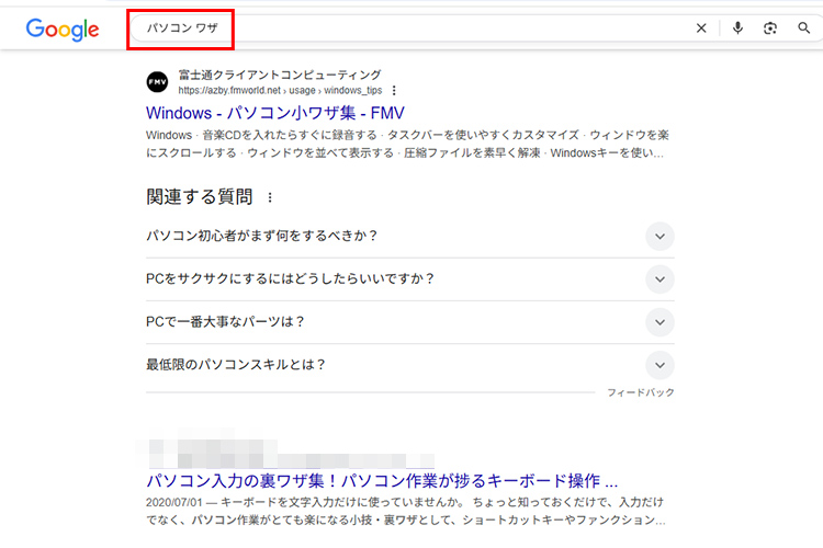 「パソコン ワザ」と入力して検索すると、両方のキーワードを含むページが検索されます。