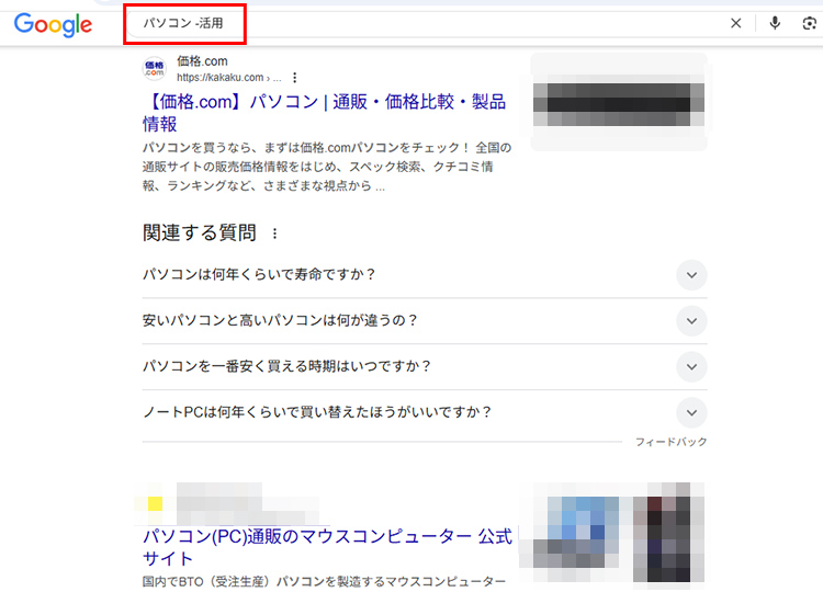 「パソコン -活用」と入力して検索すると、「パソコン」はあるが「活用」は含まないページが検索されます。