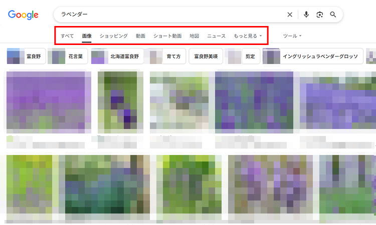 画面上部の「画像」、「ショッピング」、「動画」…などから種類を絞り込むことができます。