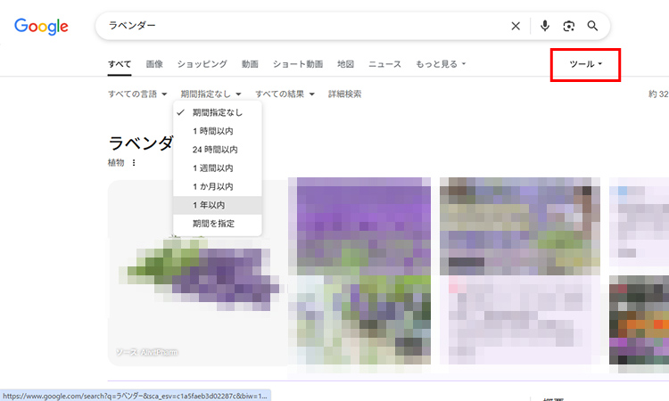 検索結果は「画像」「動画」といった種類で絞り込んで表示することができます。また、「ツール」を利用して期間を指定して絞り込むことができます。