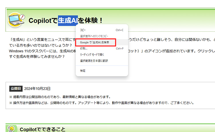 ページ内の検索したい語句をマウスでドラッグして選択し、「Googleで「●●」を検索」を選択します。