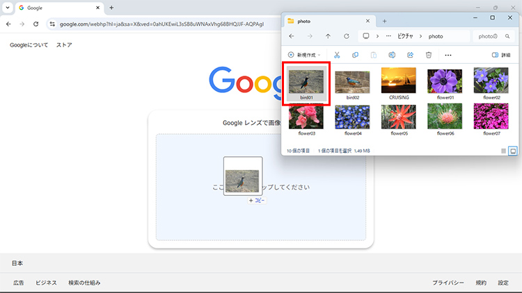 Googleで、キーワード入力欄の右側の「画像で検索」をクリックし、検索したい画像をドラッグ&ドロップすれば、画像を使った検索ができます。