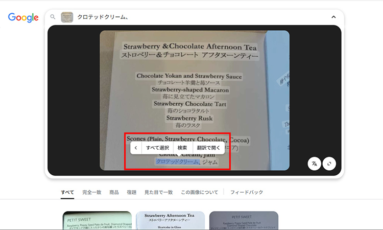 画像内の文字部分をドラッグして選択すると表示されるメニューから、選択した語句をキーワードにした検索を実行することができます。