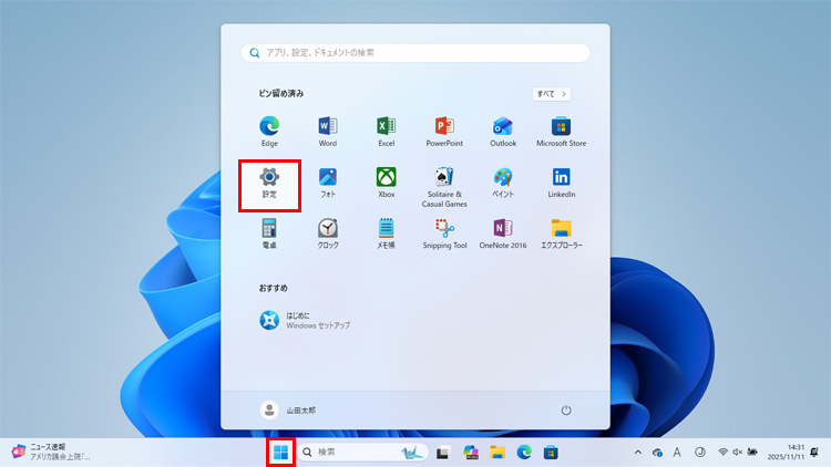 「スタート」ボタンをクリックし、「設定」をクリックします。