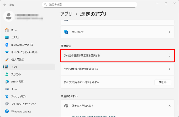 画面を下にスクロールし、「ファイルの種類で既定値を選択する」をクリックします。