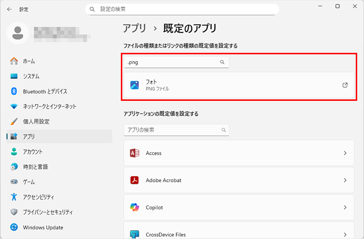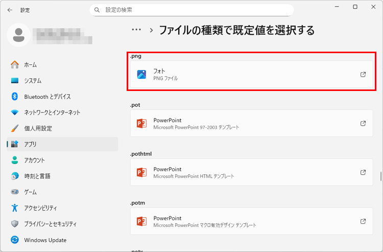 変更したい拡張子のアプリをクリックします。ここでは「.png」を選択しました。
