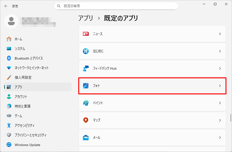 あらかじめアプリに関連付けられているファイル形式の一覧から、「既定のアプリ」を設定することもできます。例えば、「フォト」が起動してしまうファイルのうち、JPEG形式のファイルの設定を変更したい場合は、以下の手順で設定します。