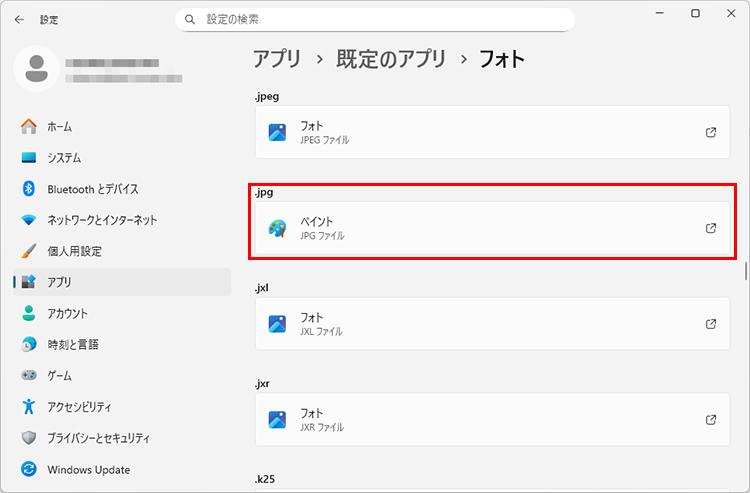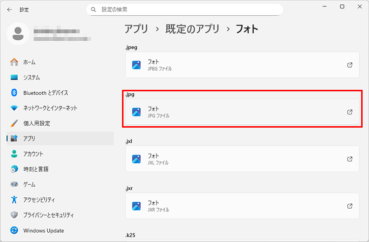 アプリに関連づけられているファイルの一覧が表示されるので、変更したい拡張子のアプリをクリックします。ここでは「.jpg」を選択しました。
