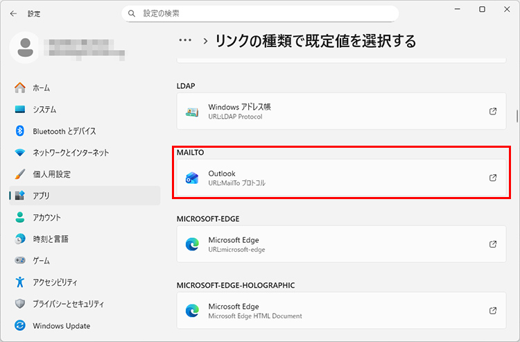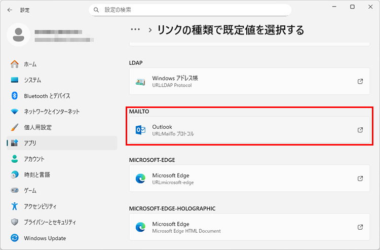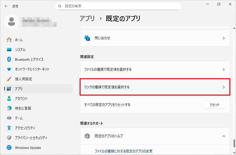 「設定」→「アプリ」→「既定のアプリ」を選択し、画面を下にスクロールして「リンクの種類で既定値を選択する」をクリックします。