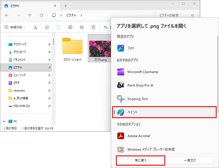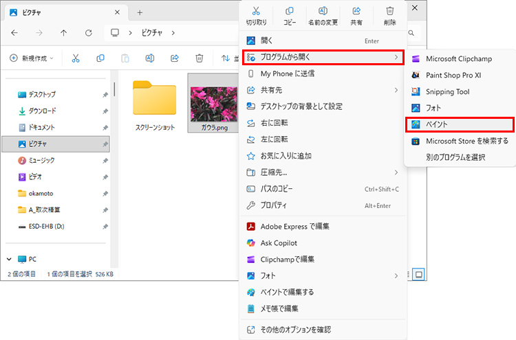 「既定のアプリ」を変更するのではなく、一時的に開くアプリを変更したいという場合は、右クリックメニューから実行できます。例えば、いつもはPNG形式のファイルは「フォト」で開いているが、今回は編集を加えたいので「ペイント」で開きたい、という場合は以下のように操作します。