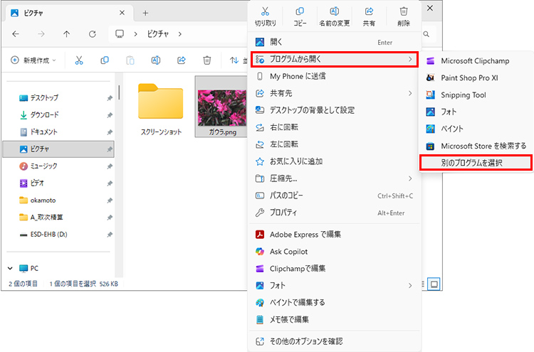 開きたいファイルを右クリックし、「プログラムから開く」を選択し、使用したいアプリを選択します。