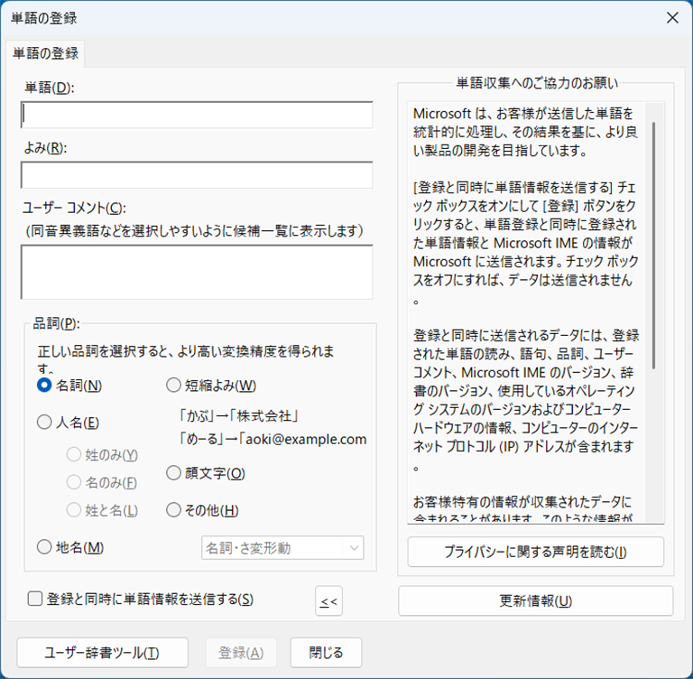 「単語の登録」画面が開きました。なお、登録した単語のリストを確認したい場合は「ユーザー辞書ツール」ボタンをクリックしてください。登録したリストが表示されます。